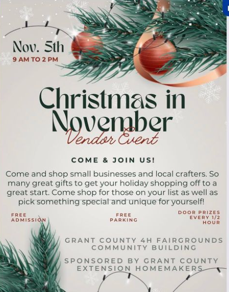 Shop Local! Grant County Extension Homemakers is hosting a local vendor event at the Grant County 4H Fairgrounds. Free parking and admission! Be sure to check out the door prizes every half hour.
