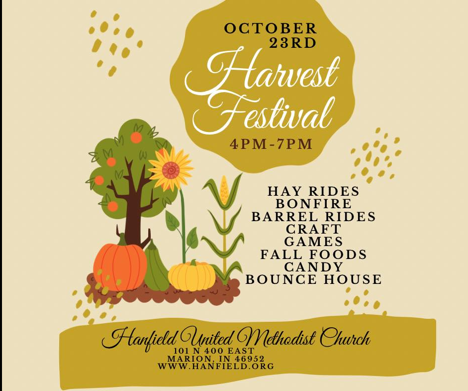 Hanfield is excited to host a Harvest Festival at our church on Sunday, October 23rd from 4pm-7pm. Enjoy all the fall favorites, including favorite fall foods (chili cook-off, hot dogs, chips, fall desserts), a bonfire for roasting s’mores, hay ride, barrel rides, craft, bounce houses, and games. We would love to have you and your family join us! Rain or shine.