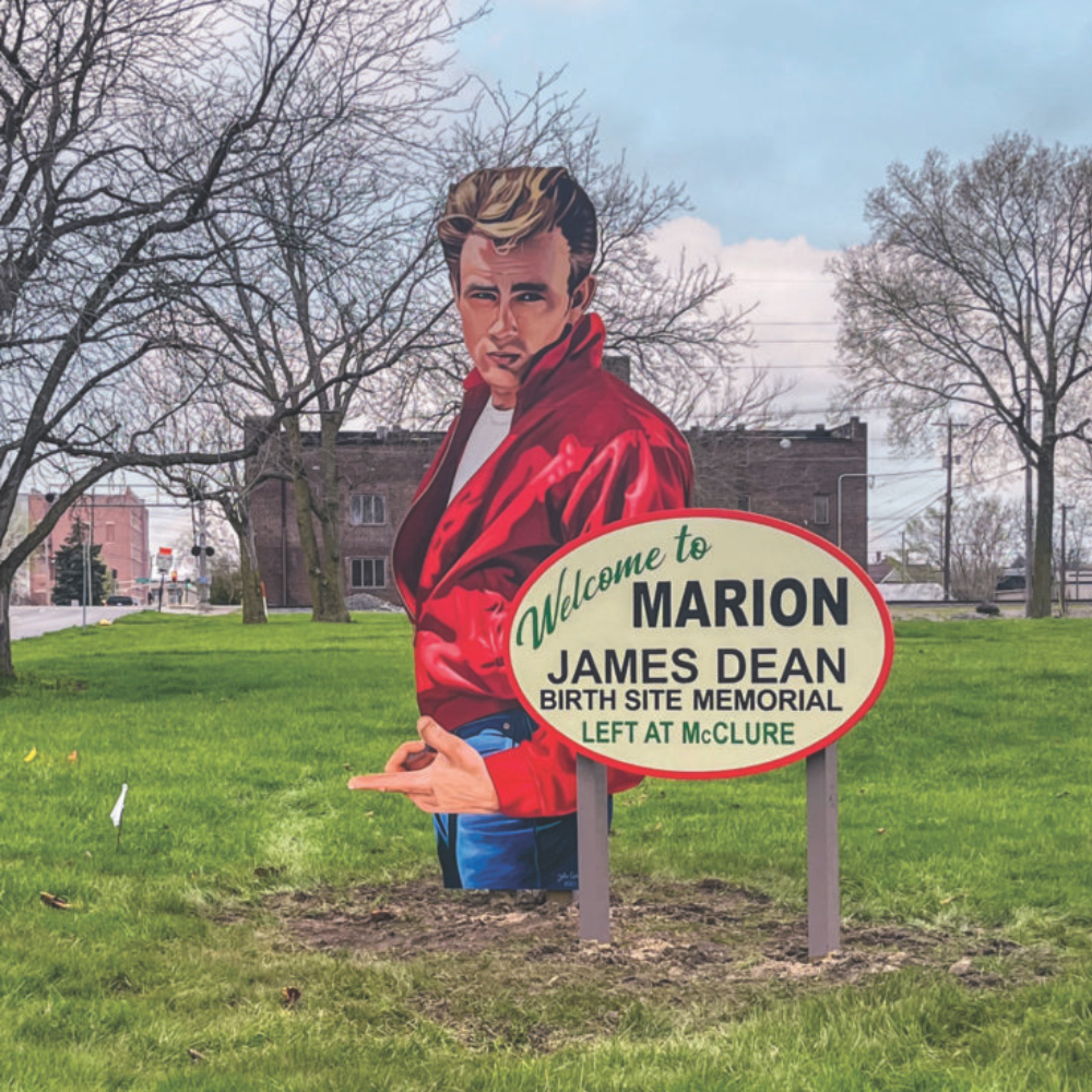 John Cerney, renowned muralist from Salinas, California, has created and installed three big  James Dean cut-out murals. The first mural is James Dean in his "rebel pose" located at the James Dean Gallery, 425 N. Main Street in Fairmount, Indiana. A second larger mural was installed in Marion on State Road 18 at the entrance.